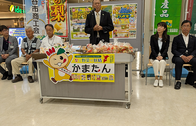 鎌ケ谷支梨業組合松本組合長及び鎌ケ谷市商工会井手会長は、イオン鎌ケ谷ショッピングセンターにて、「鎌ケ谷の梨・鎌ケ谷市ふるさと産品」即売会を開催しました。