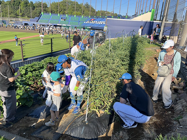 イベントに参加した子供たちは、北海道日本ハムファイターズの選手と一緒に、笑顔溢れ赤く実ったミニトマトの収穫を楽しみました。